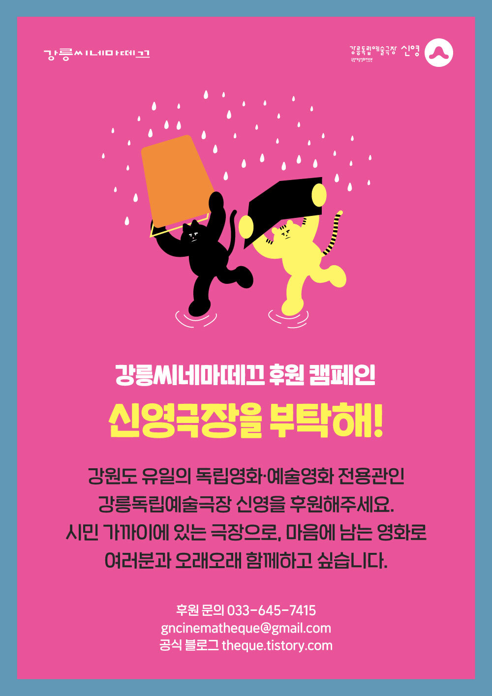 신영극장을 중심으로 한 지난 10년간의 지속적인 활동, 그에 따른 지역주민과 영화인들의 지지에도 불구하고 극장을 지원하는 2023년 지자체 보조금이 전액 삭감되면서 현재 심각한 재정위기에 처했습니다. 신영극장은 강릉 구도심 문화의 중심지이며, 관객이 다양한 영화를 만날 수 있도록 하는 중요한 공간입니다. 신영극장이 사라지는 것은 지역 문화의 한 축이 사라지는 것이기도 합니다. 신영극장이 사라지지 않도록 후원 캠페인에 동참해주세요!