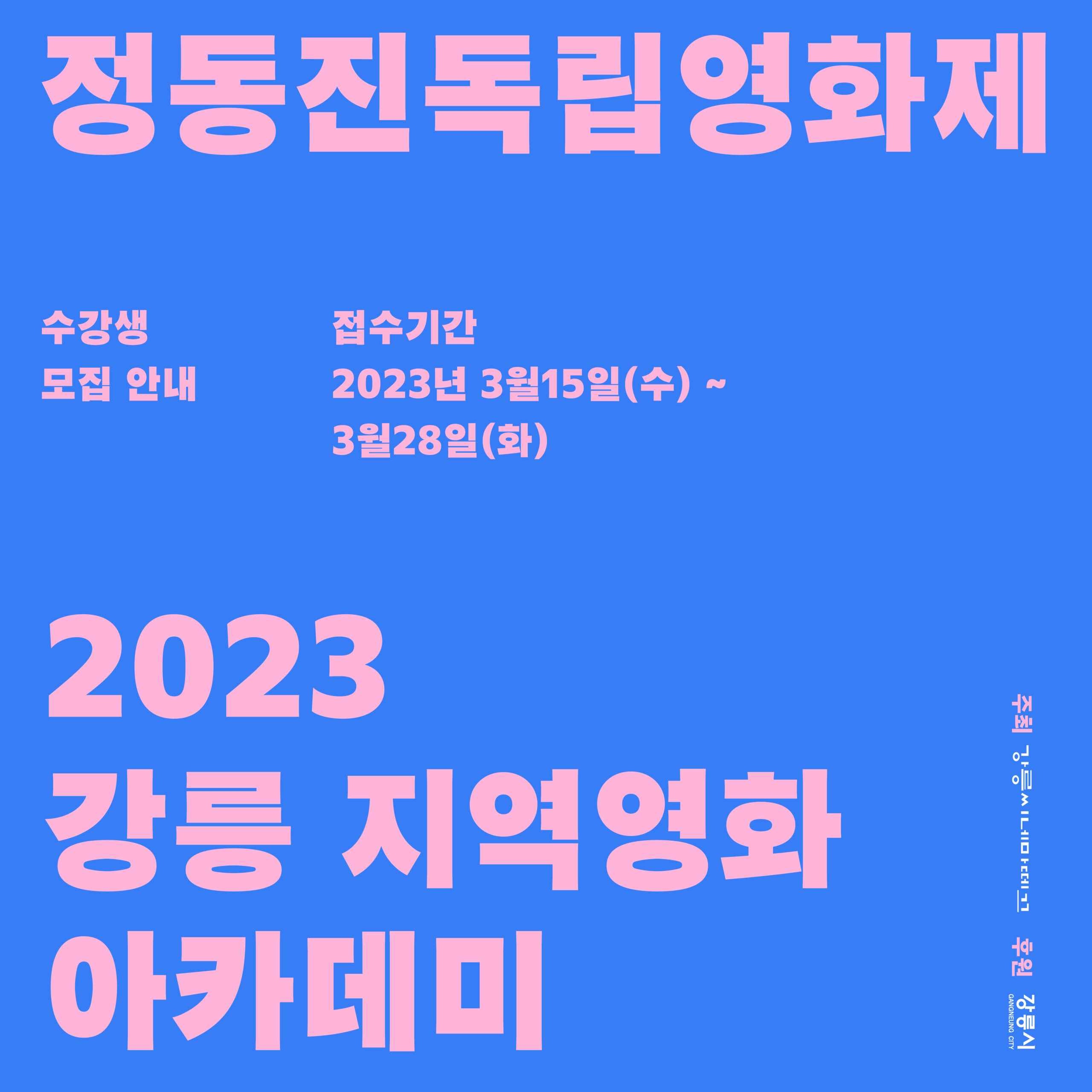 🍎 강원영상위원회가 주최하고 인디하우스, 모두(원주), 춘천영화제가 함께하는 '2023 지역영화문화활성화지원사업'이 시작됩니다. 예년과 마찬가지로 강원영화학교(극영화,다큐멘터리 제작워크숍), 씨네마실, 배우연기워크숍이 진행될 예정입니다. 자세한 일정이 정해지는대로 다시 공지드리도록 하겠습니다. |