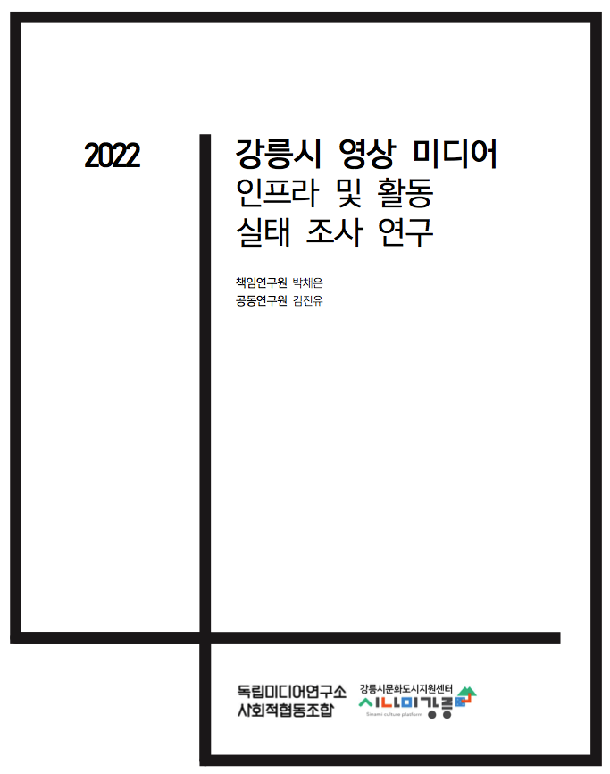 강릉시 영상미디어 인프라 및 활동실태 조사 연구 보고서가 나왔습니다. 강릉문화도시지원센터에서 진행한 연구조사로 독립미디연구소 사회적협동조합이 연구작업을 진행하였습니다. 특히 공동연구원으로 김진유 조합원이 참여하여 지역의 자세한 부분들까지 조사하여 의미있는 보고서가 완성되었습니다. 관심있으신 분들은 다운하셔서 읽어보시면 많은 도움이 될것이라고 생각합니다.